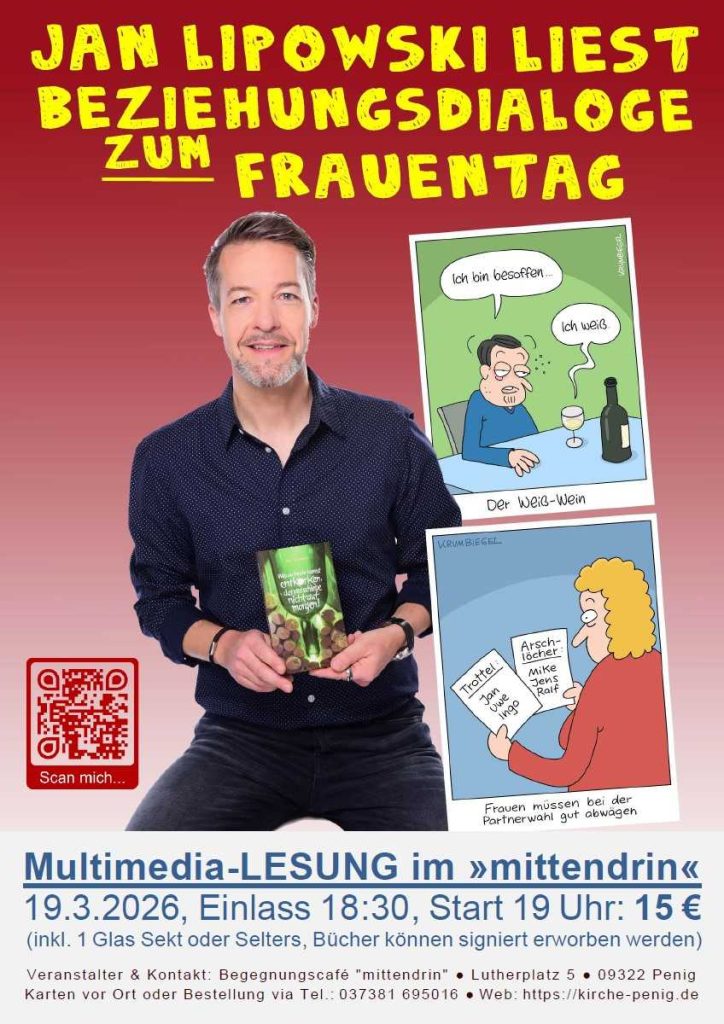Am 19.03.2026 in unserer Begegnungsstätte „mittendrin“: Jan Lipowski liest Beziehungsdialoge zum Frauentag. Die Multimedia-Lesung startet um 19:00 Uhr. Ab 18:30 Uhr heißen wir Sie herzlich willkommen! Bringen Sie ein wenig Durst mit, 15 Euro für den Eintritt, und gerne einen Beutel für ein Buch, das Sie an diesem Abend signiert erwerben können. Wir freuen uns auf Sie!